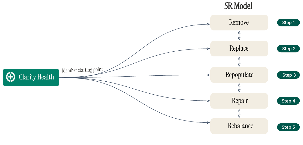 Clarity’s protocols are grounded in the 5R model. This methodology has been used for decades within functional medicine as the best framework to address healing the gut. The 5Rs are not rigid or strictly linear. Most members move through multiple phases at the same time, depending on their symptoms and test results.